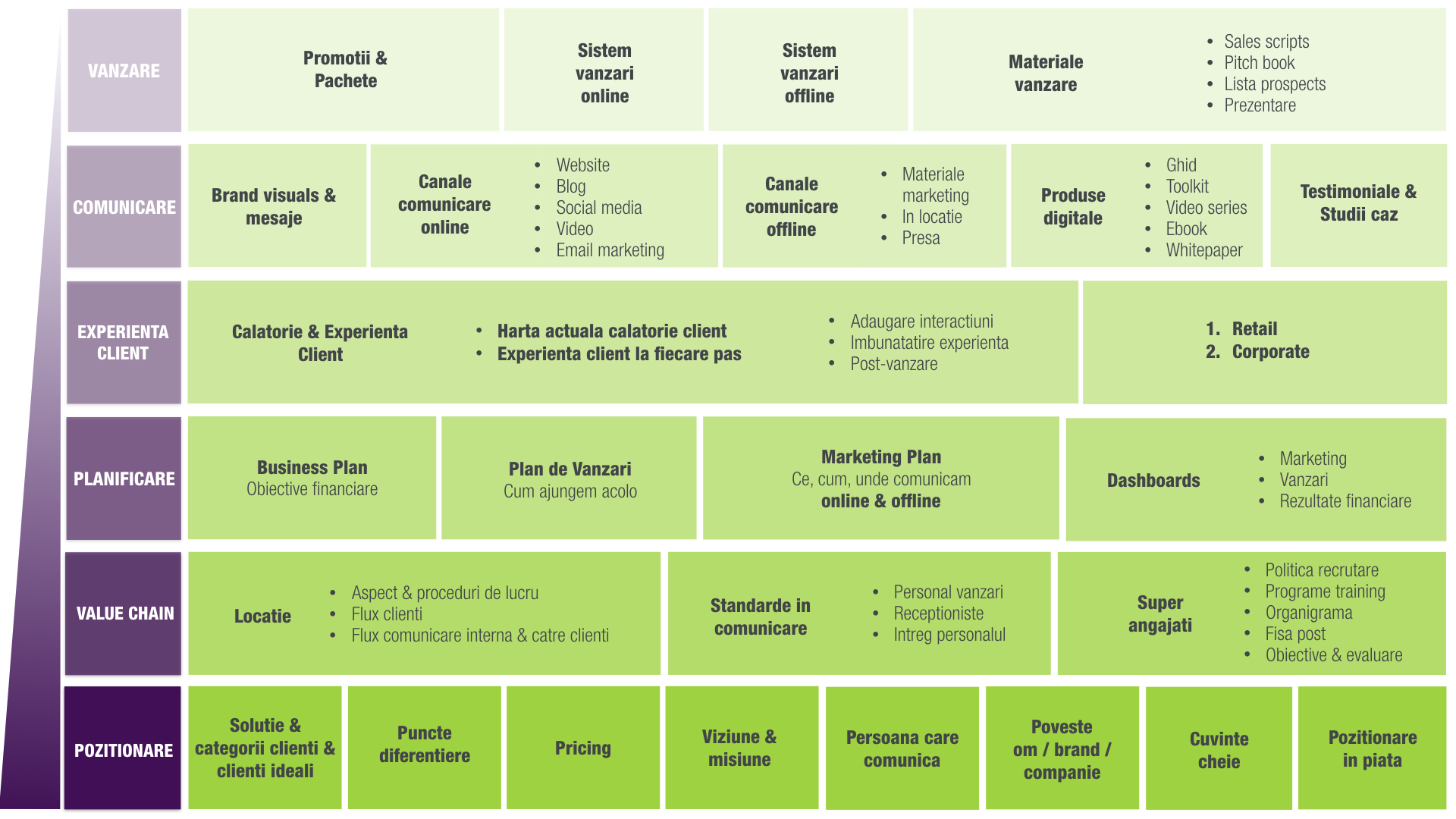 Acesta este motivul pentru care incepem toate sarcinile noastre cu un scurt audit care ne ofera o imagine exacta a companiei. Dupa aceea, vom stabili solutii practice pentru a debloca cresterea afacerii tale, pe care apoi le executam noi sau te sustinem pe tine si pe echipa ta sa le executati.